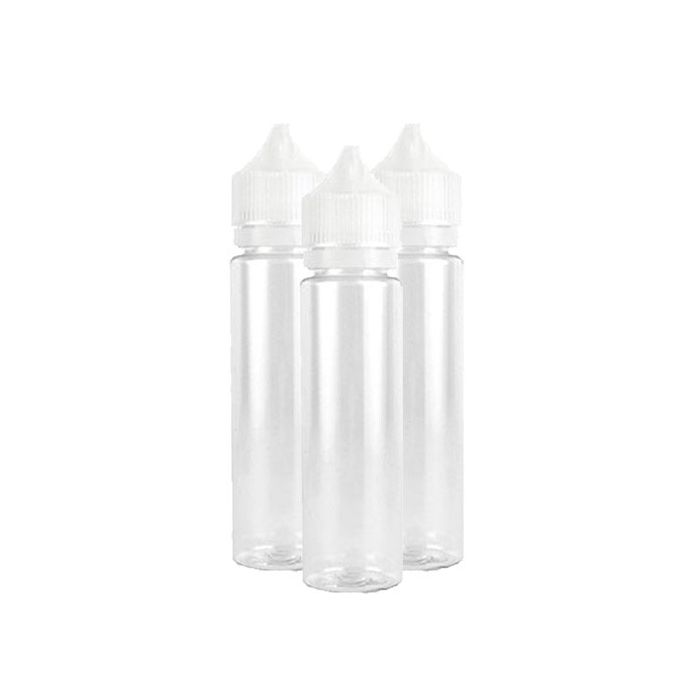 En plastflaske, udstyret med hvidt sikkerhedslåg samt en "easy tip" fyldespids. Flasken er i gennemsigtig plast, så du kan se, hvor meget væske der er i.